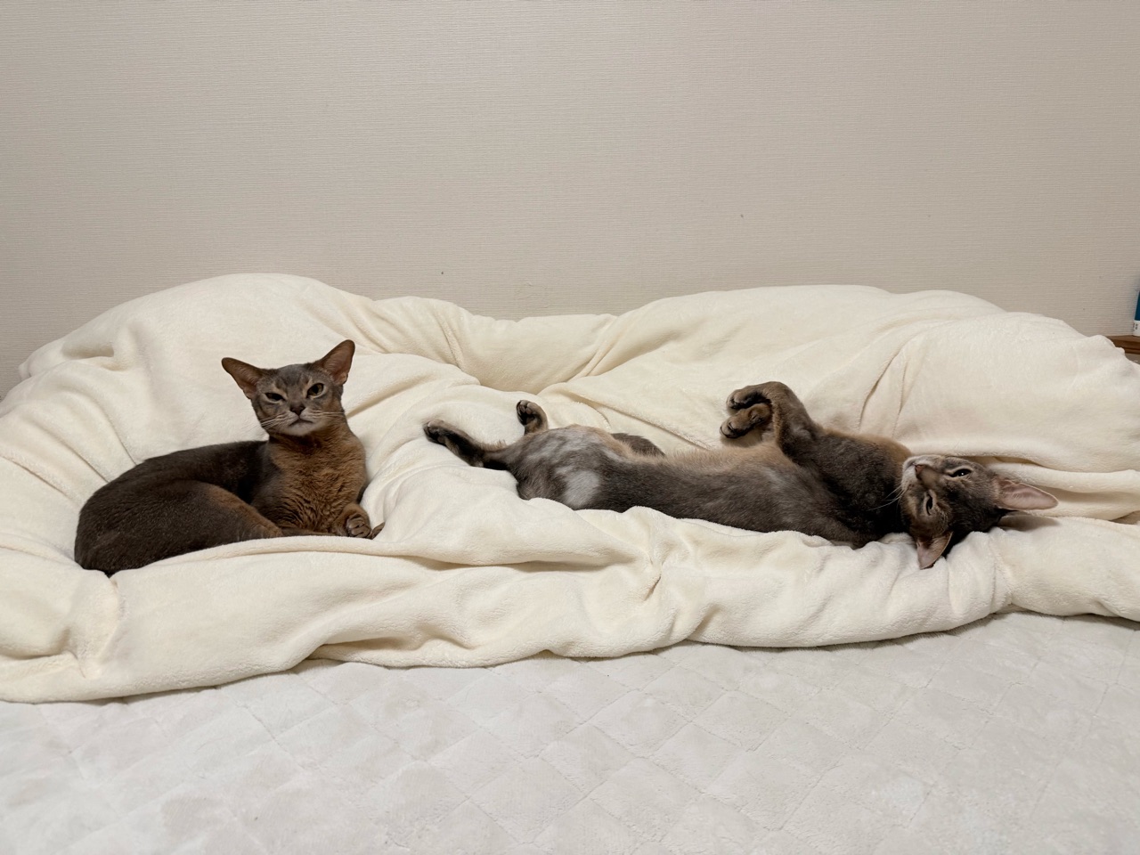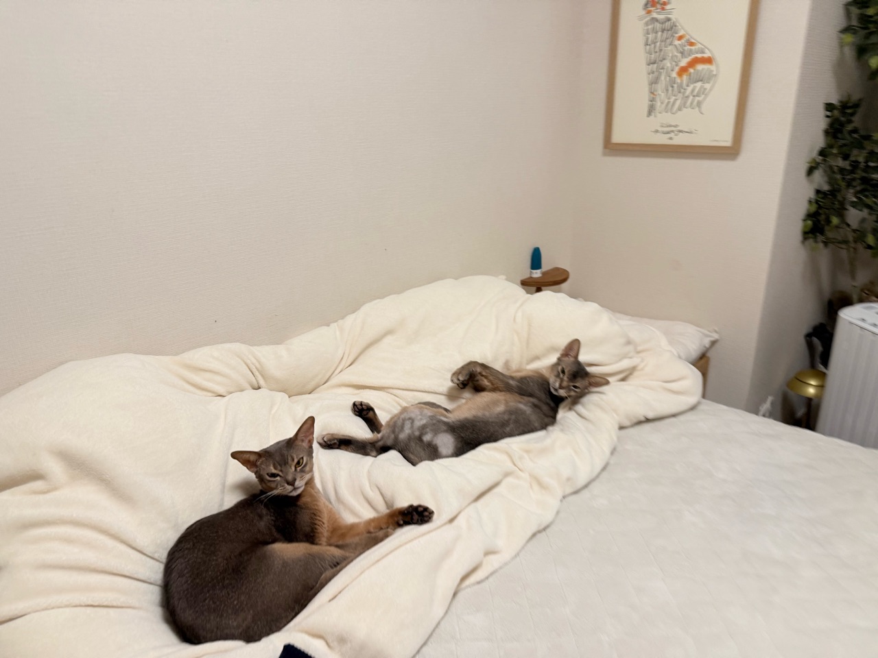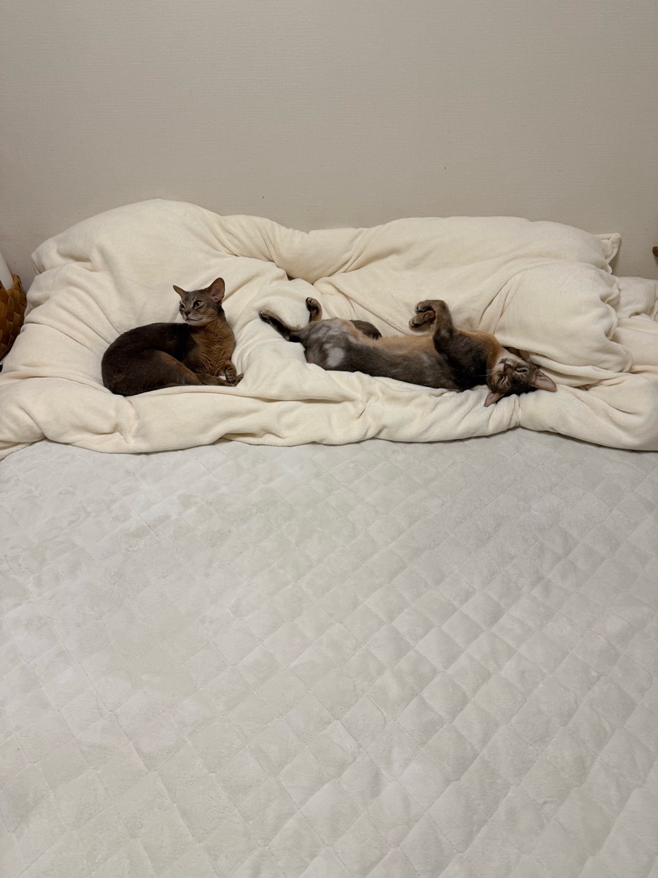 お布団の上に猫の影2つ。