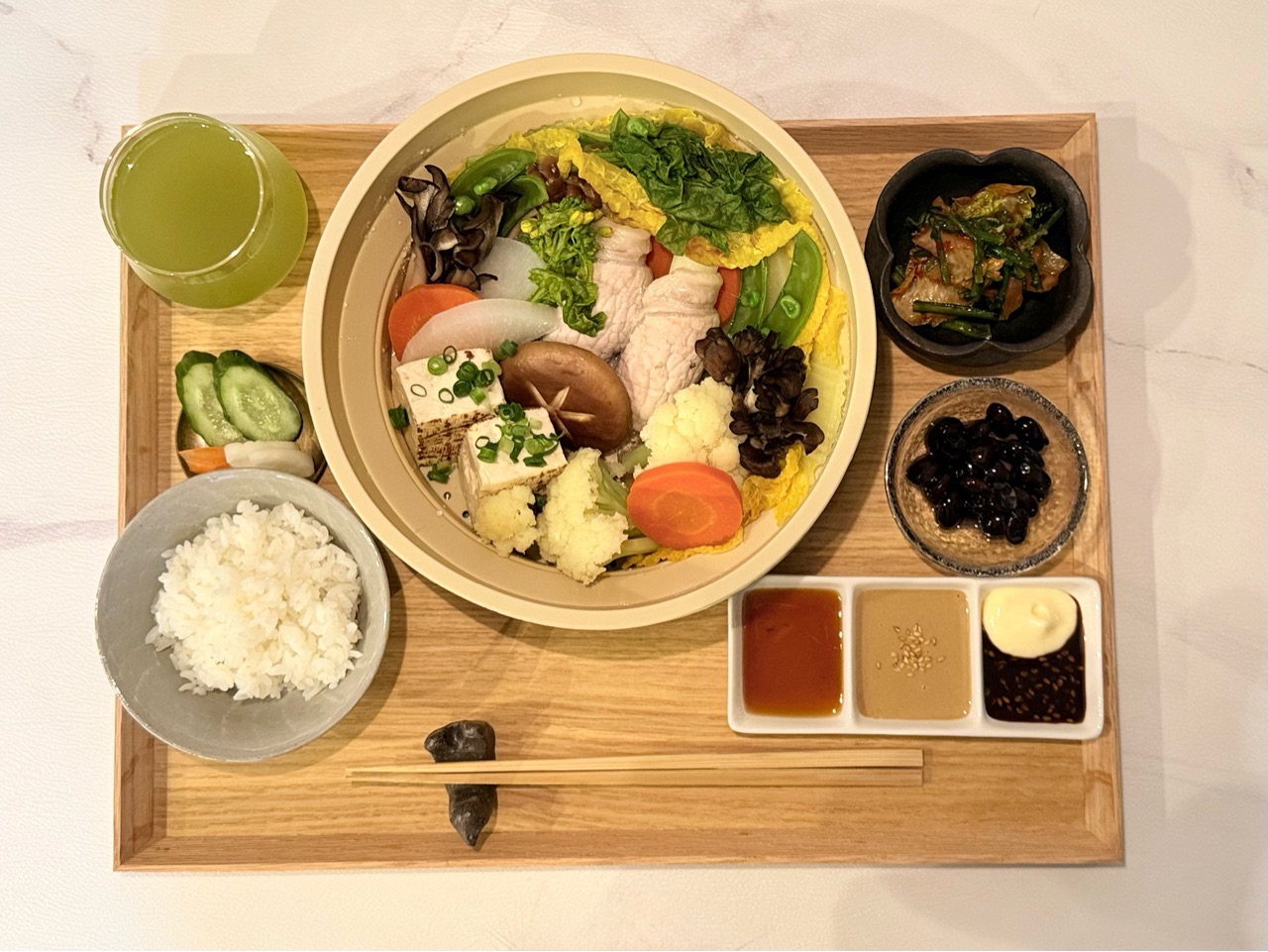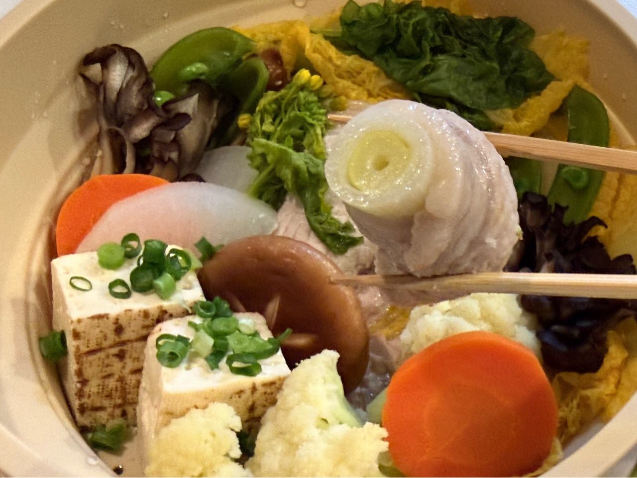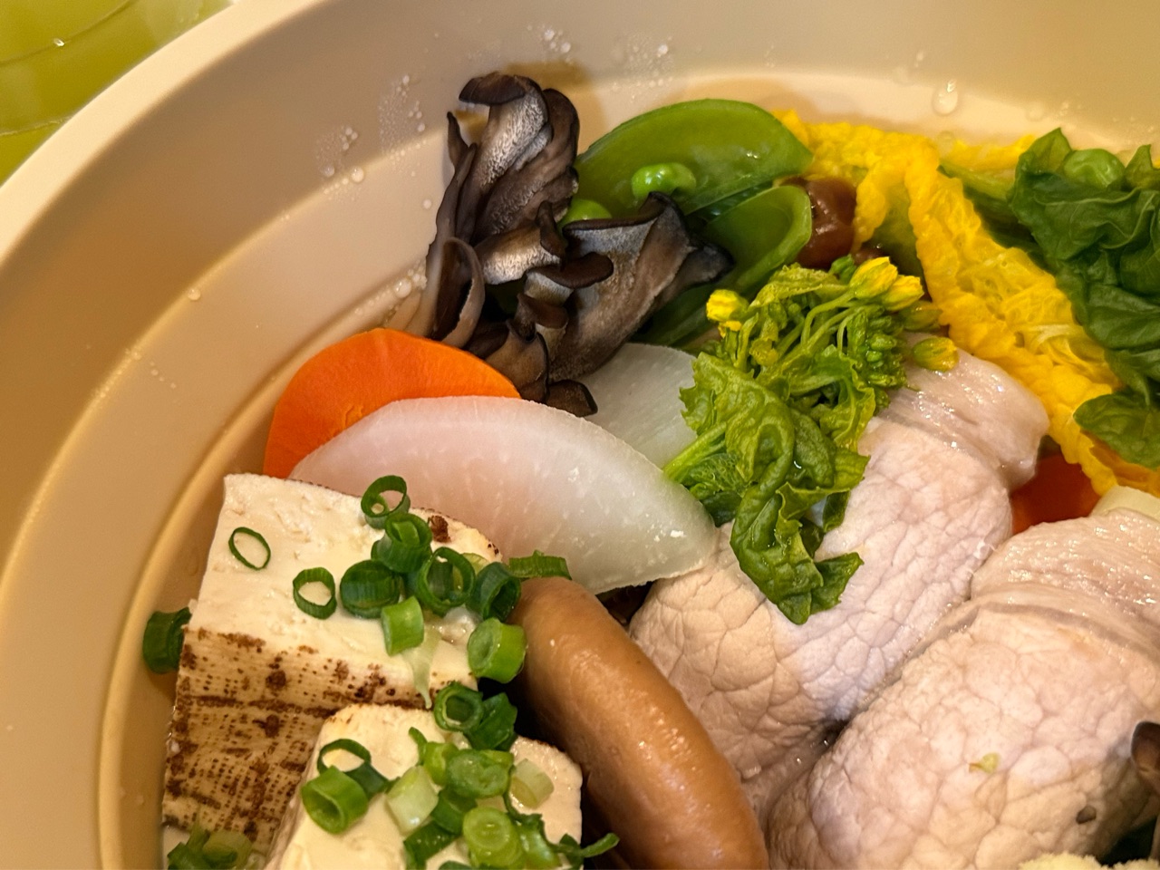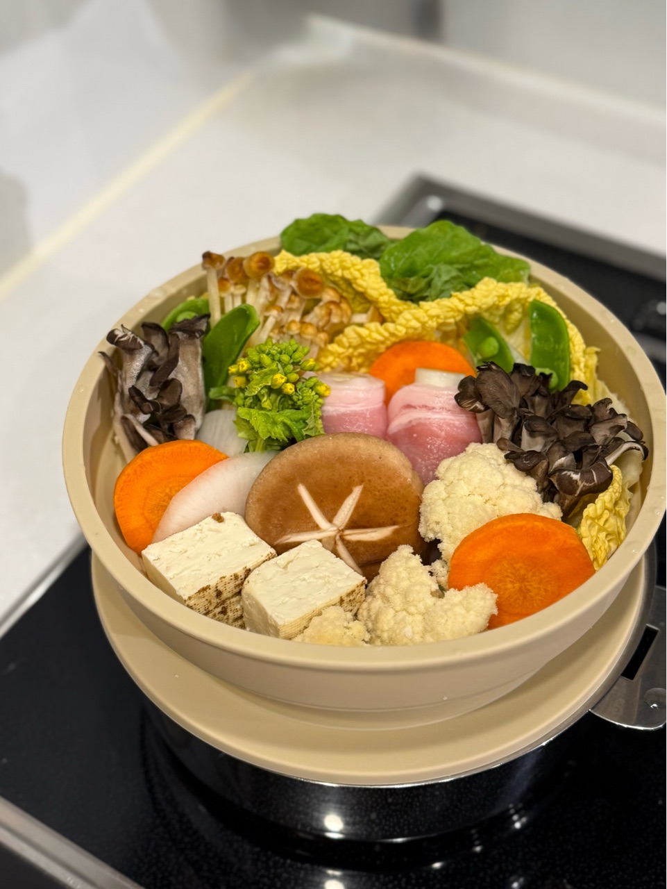 白菜、菜の花、大根、にんじん、椎茸、舞茸、ブラウンエノキ、カリフラワー、焼き豆腐と、肉巻き白ネギを並べて蒸しました。