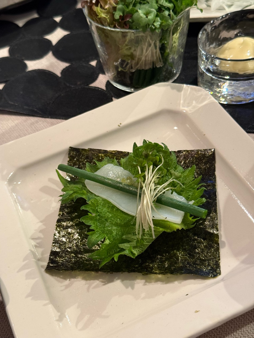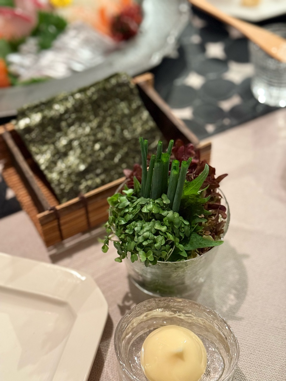 薬味もと野菜のグラス盛りと海苔など用意して手巻きをしました。