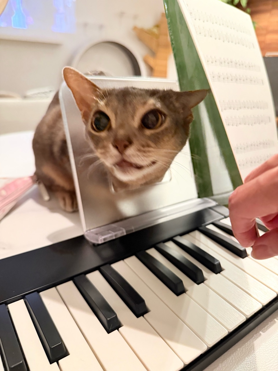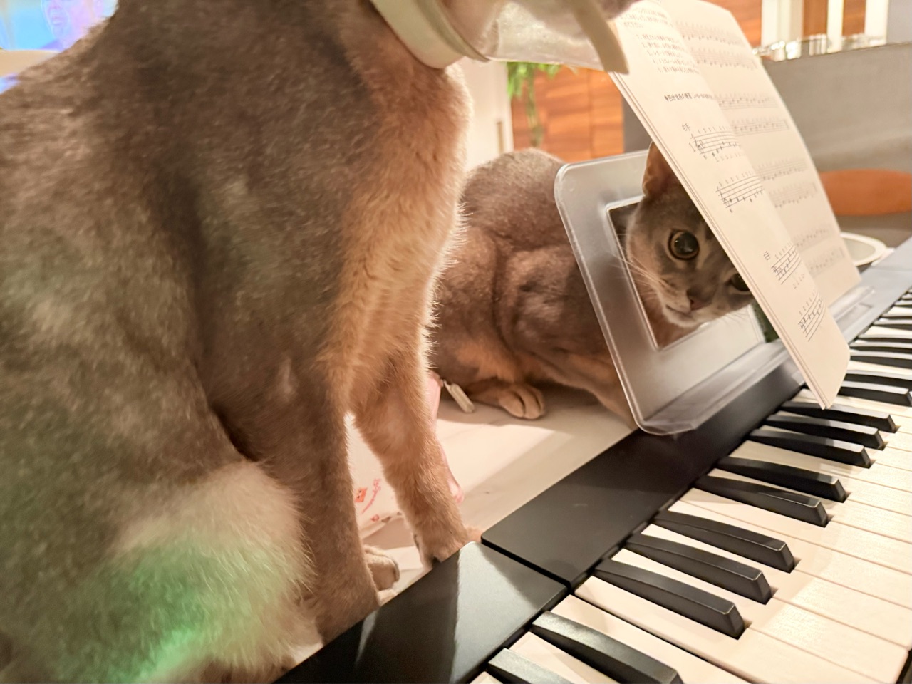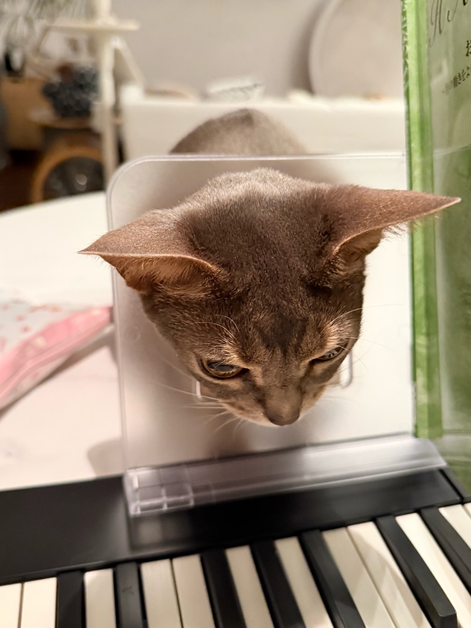 楽譜立ての穴に首突っ込んでる。