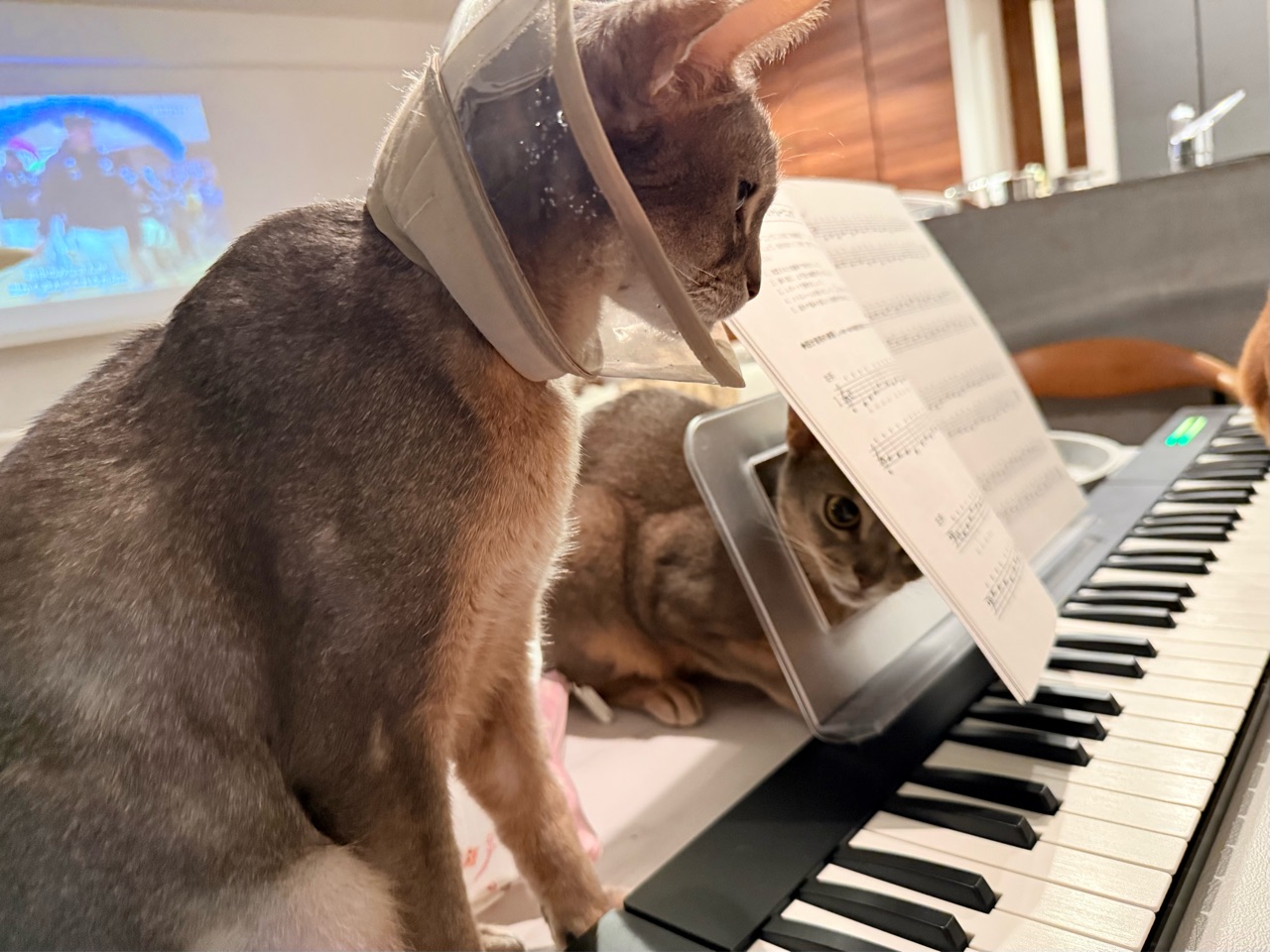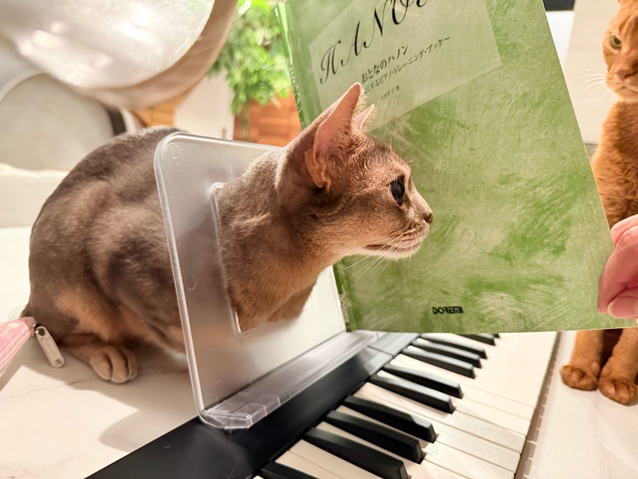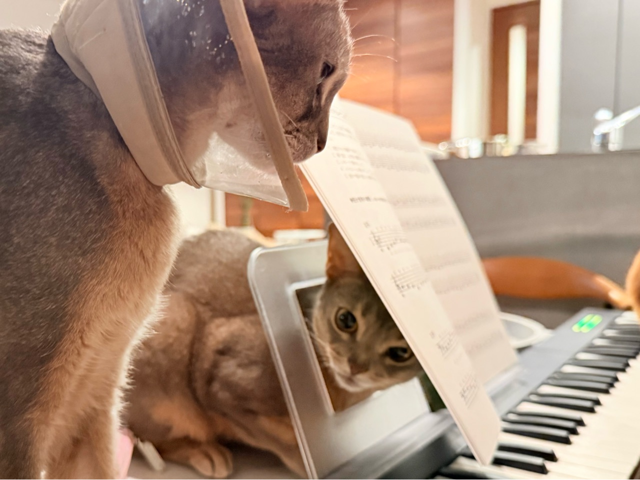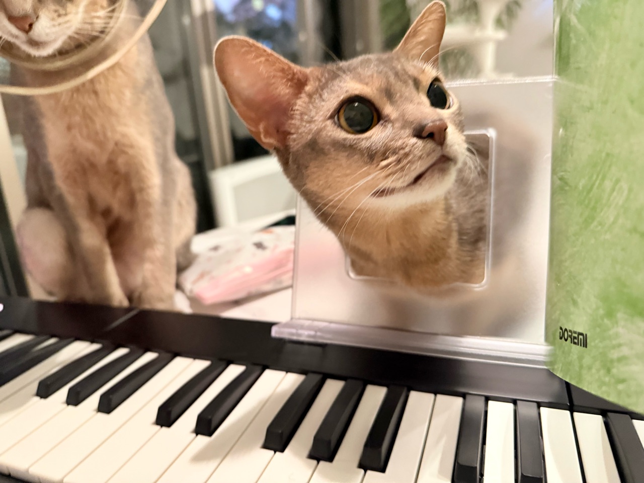 楽譜立ての穴に首突っ込んでる。